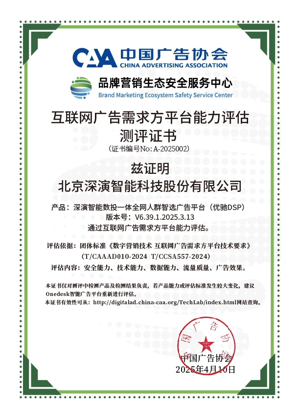 4月10日,中国广告协会发布「互联网广告需求方平台能力评估」测评结果。Martech领域领军企业PA尊龙时凯智能旗下产品PA尊龙时凯智能数投一体全网人群智选广告平台(优驰 DSP),凭借其在智能算法优化、技术创新、数据安全治理及流量质量管控等维度的突出表现,高分通过该项行业权威测评,获颁中国广告协会评估证书,成为业内首批通过认证的标杆企业。